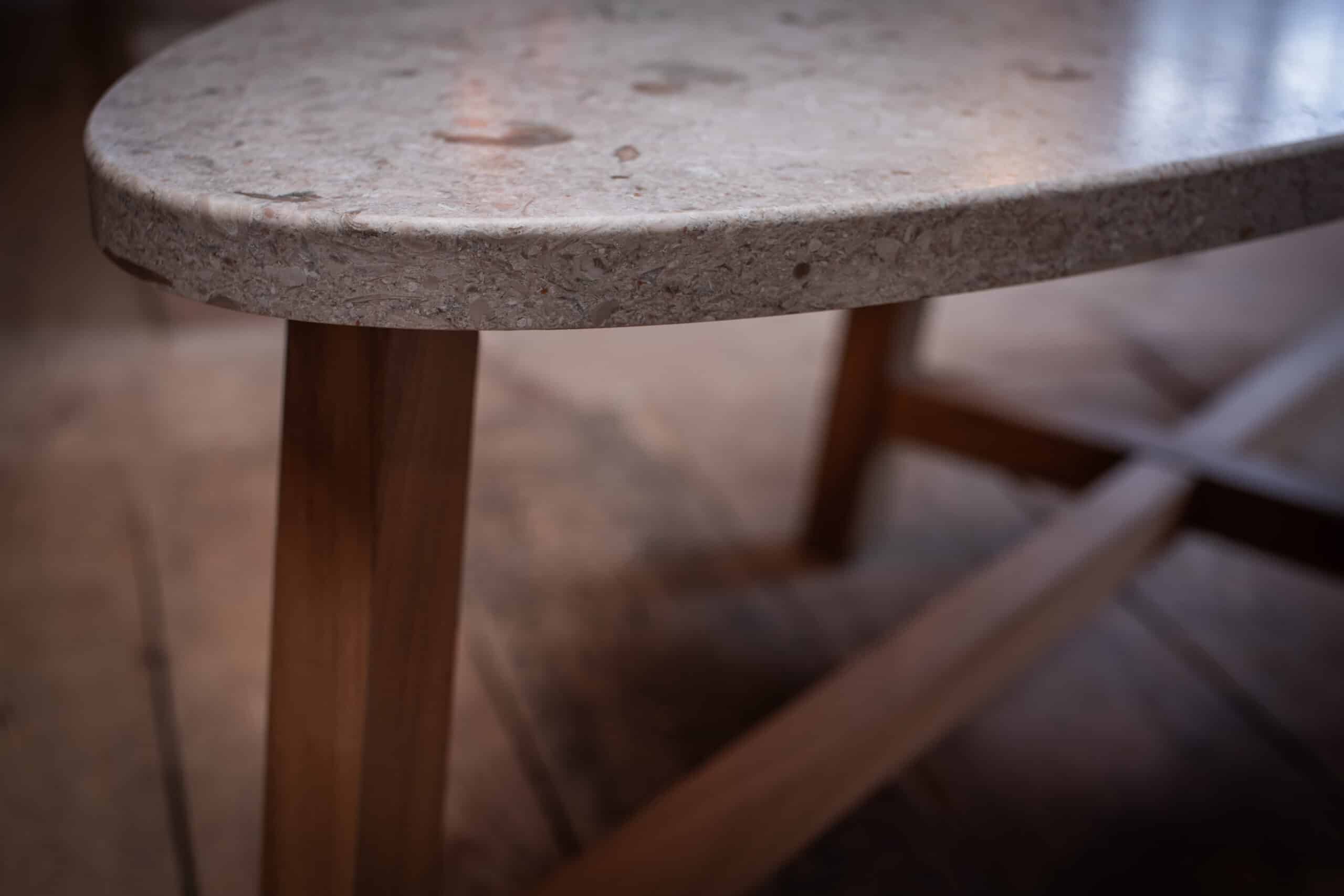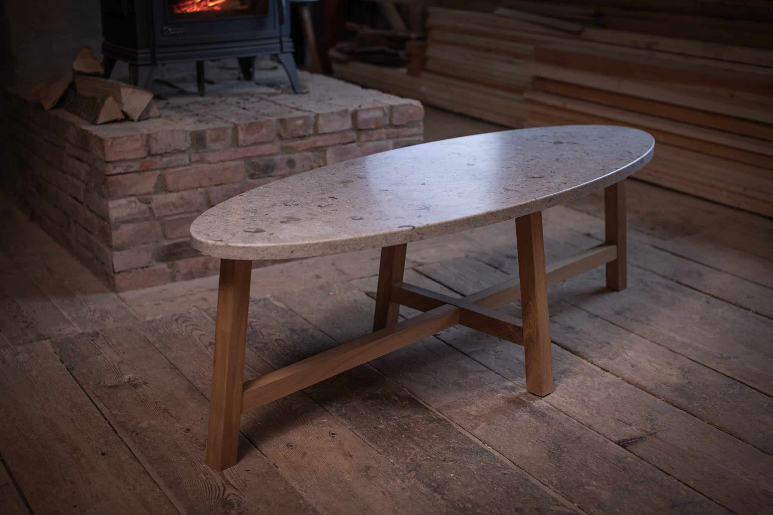 Exklusivt, ellipsformat soffbord med en skiva av kalksten och underrede i ek. För dig med höga krav på ett handgjort, lite större soffbord i naturmaterial. Ekhäll är en vidareutveckling av ett bord som Anders skapade av gamla golvplankor från mangårdsbyggnaden på Ubbatorp.